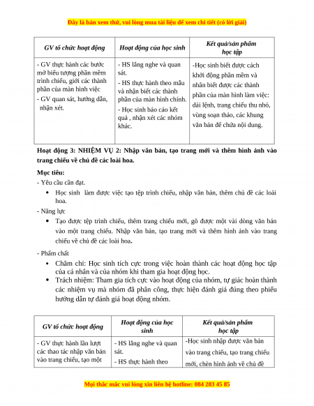 Học sinh làm được việc tạo tệp trình chiếu, nhập văn bản, thêm chủ đề các loài hoa. - Năng lực