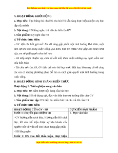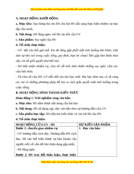 Ộ G HÌNH THÀNH KI N Ế TH C Ứ Hoạt đ ng 1 ộ : Tr i ả nghi m ệ cùng văn b n ả a. Mục tiêu: HS n m ắ đư c n ơ i ộ dung c a ủ bài h c ọ b. N i ộ dung: HS s d ử ng ụ sgk, đ c văn ọ b n t ả heo sự hư ng d ớ n c ẫ a ủ GV c. Sản phẩm h c t ọ p: ậ HS ti p t ế hu ki n t ế h c và ứ câu tr l ả i ờ c a ủ HS d. T ch ổ ức thực hi n: ệ HOẠT Đ N Ộ G C A Ủ GV - HS D K Ự IẾN SẢN PHẨM Bư c ớ 1: chuy n gi ể ao nhi m ệ vụ 1. Đ c văn b ọ ản - GV hư ng ớ d n ẫ cách đ c ọ . Hư ng ớ d n ẫ HS cách đ c, ọ l i ờ văn thể hi n ệ đư c ơ sự băn khoăn c a ủ ngư i ờ vi t ế v v ề ấn đ khó khăn đang g ề p ặ ph i ả . - HS l ng nghe. ắ Bư c ớ 2: HS trao đ i ổ th o ả lu n, ậ th c ự hi n ệ M i ọ th c ắ m c