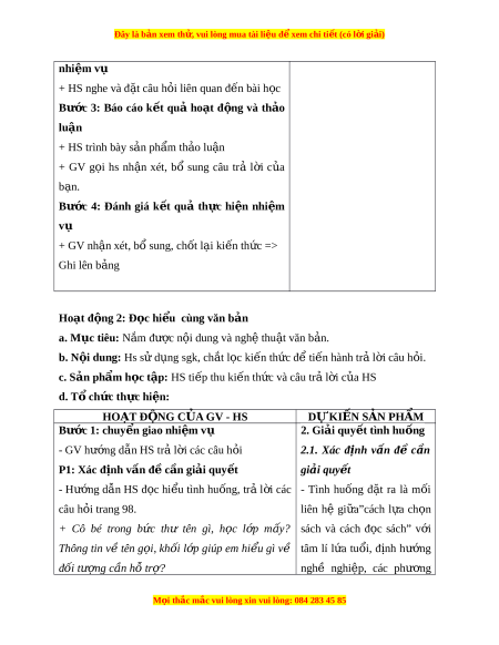 ộ dung: Hs sử d ng s ụ gk, ch t ắ l c ọ ki n t ế h c đ ứ t ể i n hành t ế r l ả i ờ câu h i ỏ . c. Sản phẩm h c t ọ p: ậ HS ti p t ế hu ki n t ế h c và ứ câu tr l ả i ờ c a ủ HS d. T ch ổ ức thực hi n: ệ HOẠT Đ N Ộ G C A Ủ GV - HS D K Ự IẾN SẢN PH M Ẩ Bư c ớ 1: chuy n gi ể ao nhi m ệ vụ 2. Giải quy t ế tình hu ng ố - GV hư ng d ớ ẫn HS tr l ả i ờ các câu h i ỏ 2.1. Xác đ nh ị v n ấ đề c n ầ P1: Xác đ nh v ị n đ ấ c ề n gi ầ i ả quy t ế giải quy t ế - Hư ng ớ d n ẫ HS đ c ọ hi u ể tình hu ng, ố tr ả l i ờ các - Tình hu ng ố đ t ặ ra là m i ố câu h i ỏ trang 98. liên hệ gi a”cách ữ l a ự ch n ọ + Cô bé trong b c ứ thư tên gì, h c ọ l p ớ m y? ấ sách và cách đ c ọ sách” v i ớ