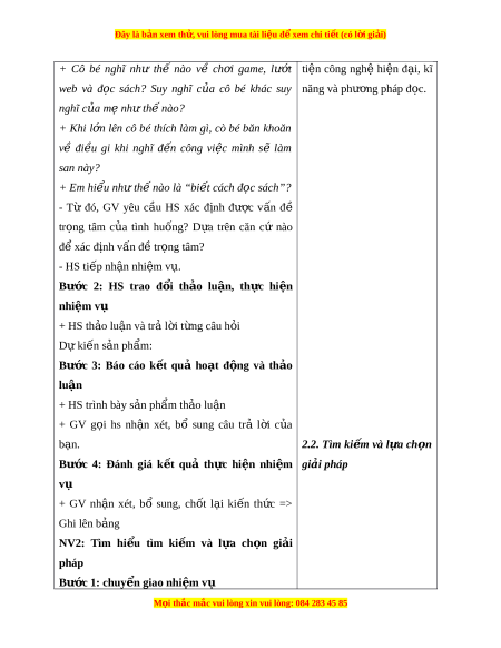ậ xét, bổ sung câu trả l i ờ c a ủ b n. ạ 2.2. Tìm ki m ế và l a ự ch n ọ Bư c ớ 4: Đánh giá k t ế quả th c ự hi n ệ nhi m ệ giải pháp vụ + GV nh n ậ xét, bổ sung, ch t ố l i ạ ki n ế th c ứ => Ghi lên b ng ả NV2: Tìm hi u ể tìm ki m ế và l a ự ch n ọ gi i ả pháp Bư c ớ 1: chuy n gi ể ao nhi m ệ vụ M i ọ th c ắ m c