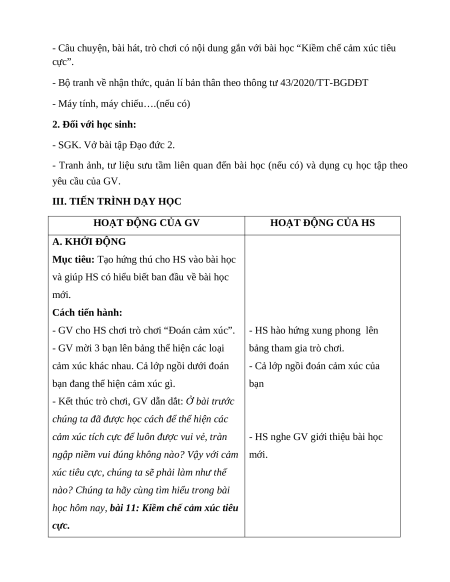 Giáo án Bài 11 Đạo đức lớp 2 Cánh diều: Kiềm chế cảm xúc tiêu cực