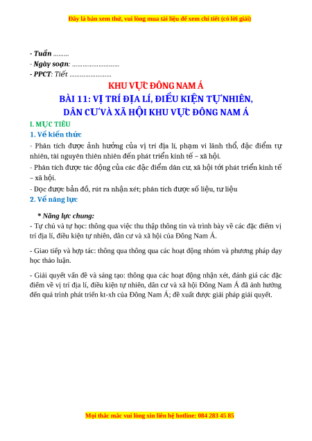 - PPCT: Ti t …………………… ế KHU V C Ự ĐÔNG NAM Á BÀI 11: V TRÍ Đ Ị A LÍ, ĐI Ị U KI Ề N T Ệ NHIÊN, Ự DÂN C VÀ XÃ H Ư I KHU V Ộ C ĐÔNG NAM Á Ự I. M C TIÊU Ụ 1. V ki ề n th ế c ứ - Phân tích đ c ượ nh ả h ng ưở c a ủ vị trí đ a ị lí, ph m ạ vi lãnh th , ổ đ c ặ đi m ể tự