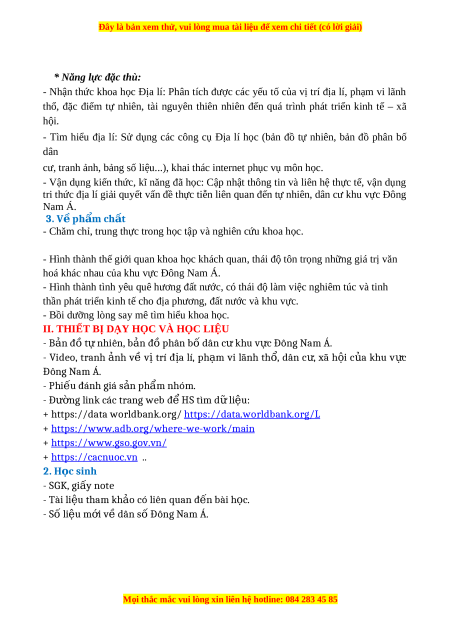 II. THIẾT BỊ DẠY HỌC VÀ HỌC LIỆU - B n đ ả t ồ nhiên, b ự n đ ả phân b ồ dân c ố khu v ư c Đông Nam Á. ự - Video, tranh nh ả về vị trí đ a ị lí, ph m ạ vi lãnh th , ổ dân c , ư xã h i ộ c a ủ khu v c ự Đông Nam Á. - Phi u đánh giá s ế n ph ả m nhóm. ẩ - Đ ng link các trang web đ ườ HS tìm d ể li ữ u: ệ