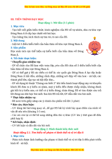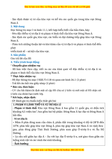 ủ HS về tự nhiên, dân cư khu v c ự Đông Nam Á c ở p h ấ c d ọ i v ướ i bài h ớ c. ọ - T o h ạ ng thú, kích thích s ứ tìm tòi, tò mò c ự a HS. ủ 2. N i dung ộ - Li t kê 3 đi ệ u ề hiểu bi t c ế a b ủ n thân v ả khu v ề c Đông Nam Á. ự 3. Sản ph m ẩ Học sinh tích c c ự thể hi n ệ sự hi u ể bi t ế c a ủ b n ả thân về Đông Nam Á. 4. T ch ổ c th ứ c hi ự n: ệ * Chuy n giao nhi ể m v ệ : ụ - GV tổ ch c ứ cho HS làm vi c ệ toàn l p, ớ yêu c u ầ HS chia s ẻ 3 đi u ề hi u ể bi t ế c a ủ b n thân v ả khu v ề c Đông Nam Á. ự - GV có thể g i ợ ý HS các đi u ề có thể là: các qu c ố gia Đông Nam Á l c ụ đ a ị ho c ặ Đông Nam Á h i ả đ o, ả nh ng ữ c nh ả đ p, ẹ nh ng ữ nét đ p