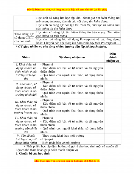 * GV giao nhiệm vụ cho từng nhóm, hướng dẫn lập kế hoạch nhóm. Điều Nhóm Nội dung nhiệm vụ chỉnh nhiệm vụ I. Khai thác, sử - Phạm vi dụng và bảo vệ