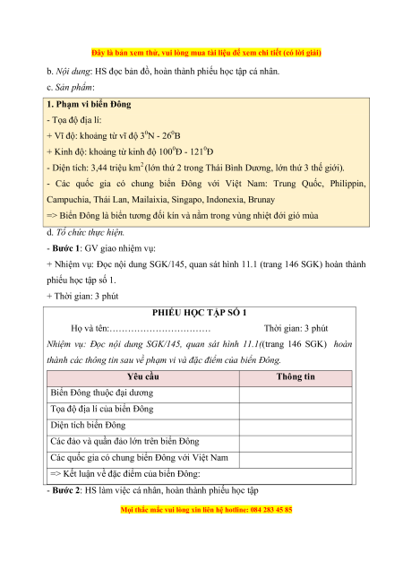 b. Nội dung: HS đọc bản đồ, hoàn thành phiếu học tập cá nhân. c. Sản phẩm: 1. Phạm vi biển Đông - Tọa độ địa lí: