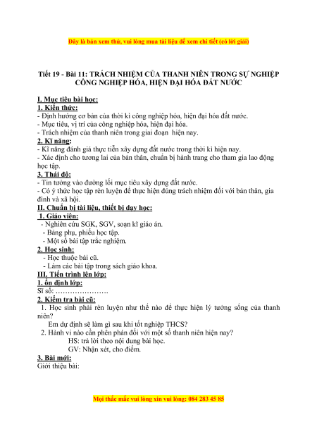 Tiết 19 - Bài 11: TRÁCH NHIỆM CỦA THANH NIÊN TRONG SỰ NGHIỆP