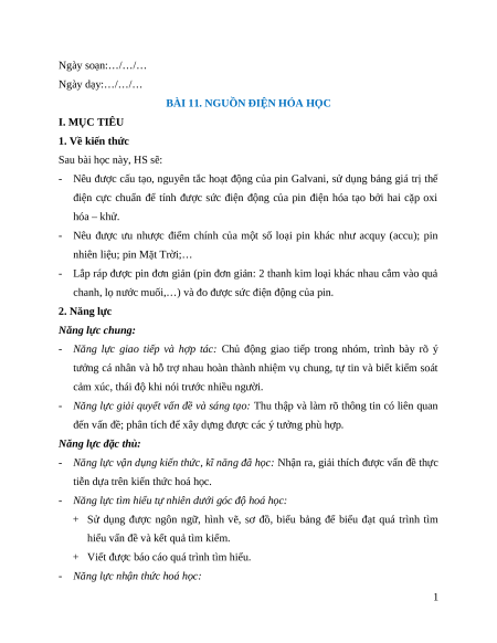 BÀI 11. NGUỒN ĐIỆN HÓA HỌC I. MỤC TIÊU 1. Về kiến thức Sau bài học này, HS sẽ: