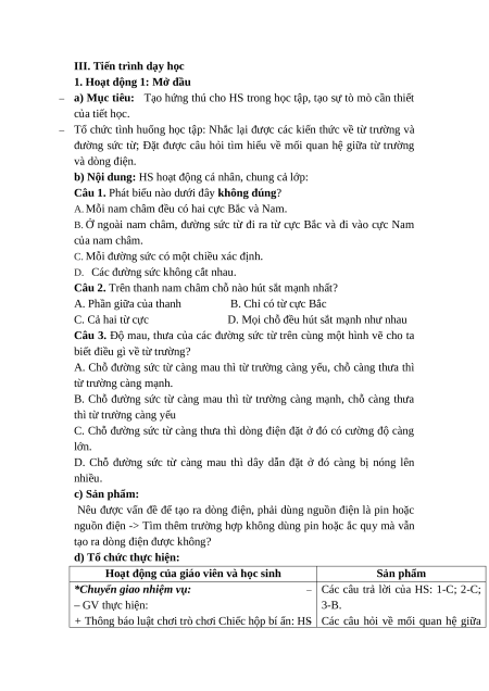 – Tổ chức tình huống học tập: Nhắc lại được các kiến thức về từ trường và