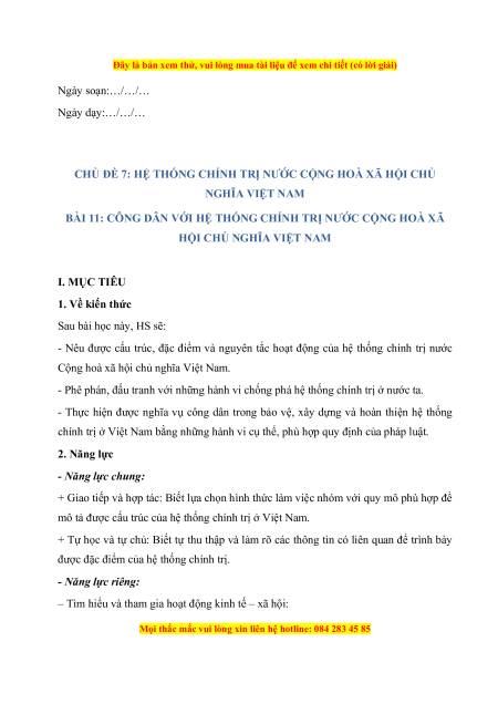 BÀI 11: CÔNG DÂN VỚI HỆ THỐNG CHÍNH TRỊ NƯỚC CỘNG HOÀ XÃ HỘI CHỦ NGHĨA VIỆT NAM I. MỤC TIÊU 1. Về kiến thức Sau bài học này, HS sẽ: