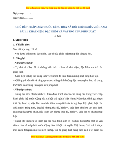 BÀI 11: KHÁI NIỆM, ĐẶC ĐIỂM VÀ VAI TRÒ CỦA PHÁP LUẬT (3 tiết) I. MỤC TIÊU 1. Về kiến thức Sau bài học này, HS sẽ: