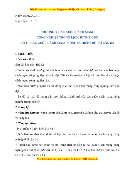 BÀI 11: CÁC CUỘC CÁCH MẠNG CÔNG NGHIỆP THỜI KÌ CẬN ĐẠI I. MỤC TIÊU 1. Về kiến thức Sau bài học này, HS sẽ: