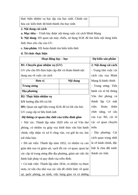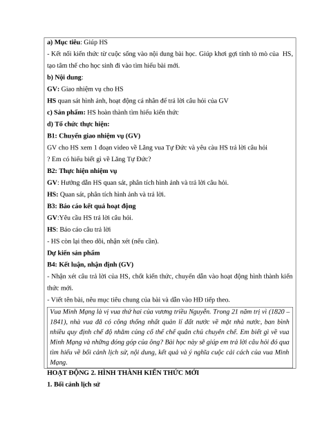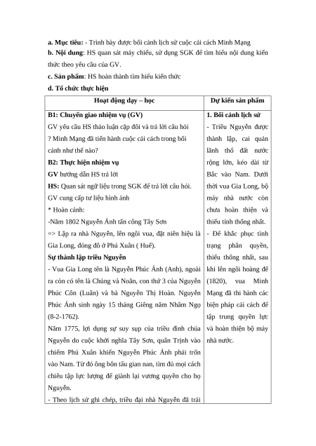 a. Mục tiêu: - Trình bày được bối cảnh lịch sử cuộc cải cách Minh Mạng