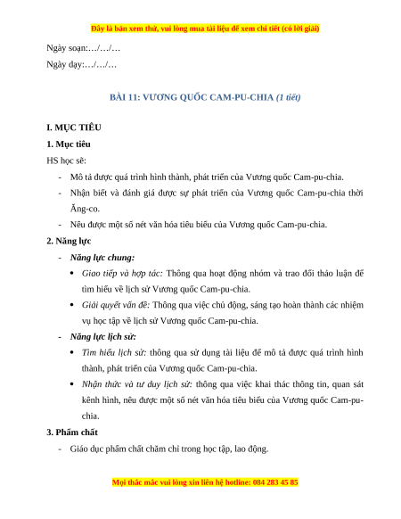 BÀI 11: VƯƠNG QUỐC CAM-PU-CHIA (1 tiết) I. MỤC TIÊU 1. Mục tiêu HS học sẽ:
