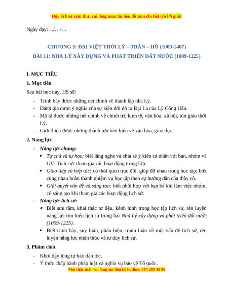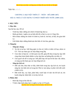 BÀI 11: NHÀ LÝ XÂY DỰNG VÀ PHÁT TRIỂN ĐẤT NƯỚC (1009-1225) I. MỤC TIÊU 1. Mục tiêu Sau bài học này, HS sẽ: