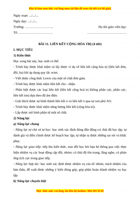 BÀI 11. LIÊN KẾT CỘNG HÓA TRỊ (4 tiết) I. MỤC TIÊU 1) Kiến thức