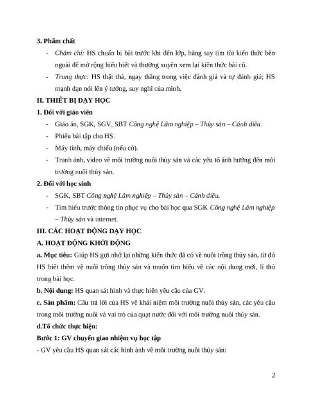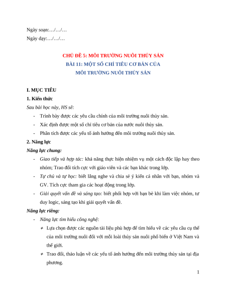 - Phân tích được các yếu tố ảnh hưởng đến môi trường nuôi thủy sản. 2. Năng lực