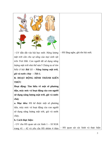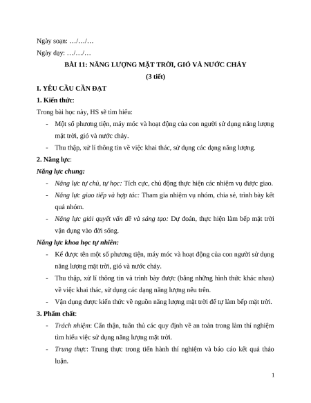 BÀI 11: NĂNG LƯỢNG MẶT TRỜI, GIÓ VÀ NƯỚC CHẢY (3 tiết)