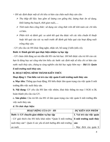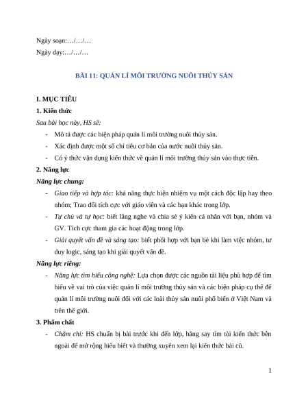 Giáo án Bài 11: Quản lí môi trường nuôi thuỷ sản Công nghệ Lâm nghiệp Thủy sản 12 Kết nối tri thức