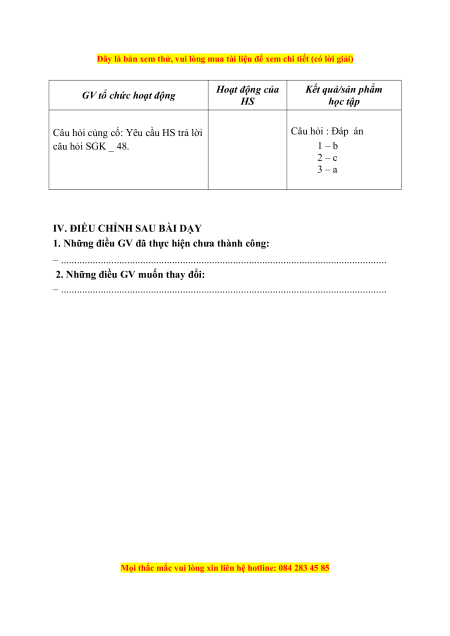 Câu hỏi củng cố: Yêu cầu HS trả lời Câu hỏi : Đáp án câu hỏi SGK _ 48. 1 – b 2 – c 3 – a
