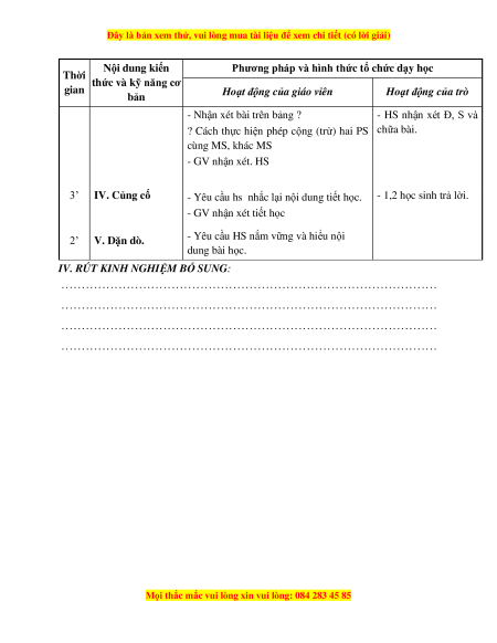 ? Cách thực hiện phép cộng (trừ) hai PS chữa bài. cùng MS, khác MS - GV nhận xét. HS 3’ IV. Củng cố
