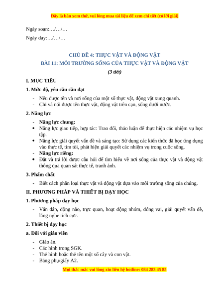 BÀI 11: MÔI TRƯỜNG SỐNG CỦA THỰC VẬT VÀ ĐỘNG VẬT (3 tiết) I. MỤC TIÊU