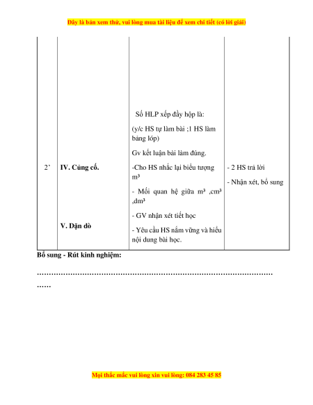 - Mối quan hệ giữa m³ ,cm³ ,dm³ - GV nhận xét tiết học V. Dặn dò