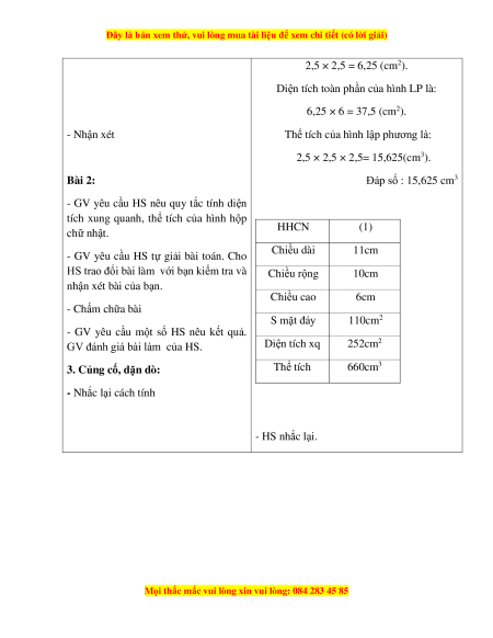 Diện tích toàn phần của hình LP là: 6,25 × 6 = 37,5 (cm2). - Nhận xét