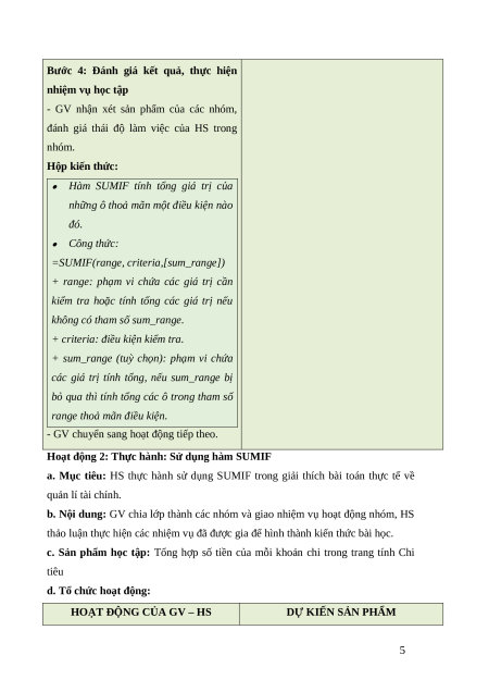 - GV yêu cầu HS hoạt động nhóm đôi em sử dụng hàm tính tổng theo điều kiện hoàn thành Hoạt động 1: SUMIF.