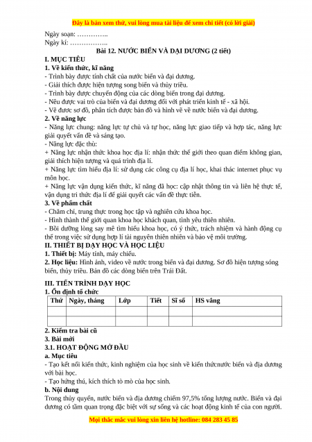 Bài 12. NƯỚC BIỂN VÀ DẠI DƯƠNG (2 tiết) I. MỤC TIÊU