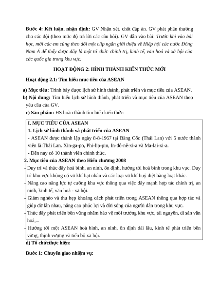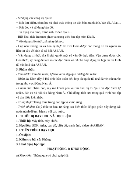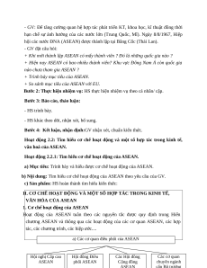 kiến thức, kỹ năng để làm rõ các đặc điểm về cơ chế hoạt động và hợp tác về kinh tế, văn hoá của ASEAN. 3. Phẩm chất: