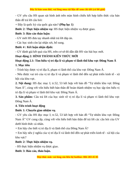 Hoạt động 2.1: Tìm hiểu vị trí địa lí và phạm vi lãnh thổ khu vực Đông Nam Á 1. Mục tiêu