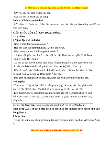 Hoạt động 2.2: Tìm hiểu điều kiện tự nhiên và tài nguyên thiên nhiên khu vực Đông Nam Á 1. Mục tiêu