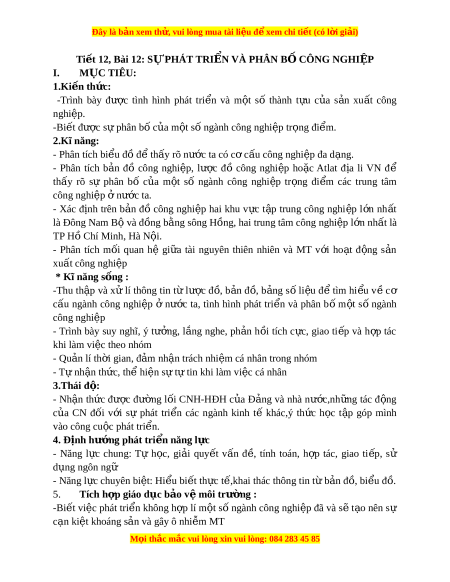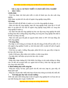 Đây là bản xem th , vu ử i lòng mua tài li u ệ đ xe ể m chi ti t (c ế ó l i ờ gi i ả ) Ti t ế 12, Bài 12: S P Ự HÁT TRI N Ể VÀ PHÂN B C Ố ÔNG NGHI P Ệ I. M C Ụ TIÊU: 1.Ki n t ế h c: ứ -Trình bày đư c ợ tình hình phát tri n ể và m t ộ số thành t u ự c a ủ s n ả xu t ấ công nghiệp. -Bi t ế đư c ợ sự phân b c ố a ủ m t ộ s ngành công nghi ố p t ệ r ng đi ọ m ể . 2.Kĩ năng: - Phân tích bi u đ ể đ ồ t ể h y r ấ õ nư c ớ ta có c c ơ u công nghi ấ p đa d ệ ng. ạ - Phân tích b n ả đồ công nghi p, ệ lư c ợ đồ công nghi p ệ ho c ặ Atlat đ a ị li VN để thấy rõ sự phân bố c a ủ m t ộ số ngành công nghi p ệ tr ng ọ đi m ể các trung tâm công nghiệp n ở ước ta. - Xác đ nh ị trên b n ả đồ công nghi p ệ hai khu v c ự t p ậ trung công nghi p ệ l n ớ nh t ấ là Đông Nam B và đ ộ ng b ồ ng ằ sông H ng, hai ồ trung tâm công nghi p l ệ n ớ nh t ấ là TP Hồ Chí Minh, Hà N i ộ . - Phân tích m i ố quan hệ gi a