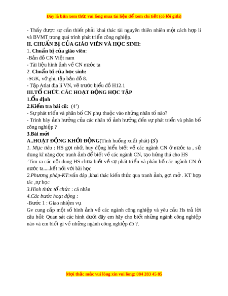 và BVMT trong quá trình phát tri n công nghi ể p. ệ II. CHUẨN BỊ C A Ủ GIÁO VIÊN VÀ H C Ọ SINH: 1. Chuẩn b c ị a g ủ iáo viên: -B n ả đồ CN Vi t ệ nam - Tài li u hì ệ nh nh v ả C ề N nư c t ớ a 2. Chuẩn b c ị a h ủ c s ọ inh: -SGK, v ghi ở , t p b ậ n ả đ 8. ồ - T p ậ Atlat đ a ị lí VN, v t ẽ rư c ớ bi u đ ể H ồ 12.1 III.T C Ổ H C Ứ CÁC HO T Ạ Đ N Ộ G H C Ọ T P Ậ 1. n đ Ổ nh ị 2.Ki m