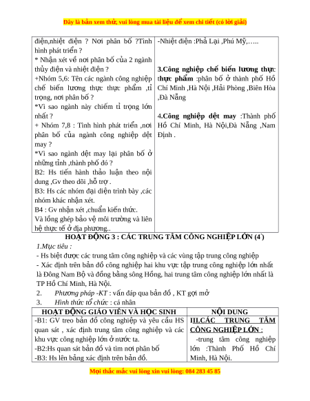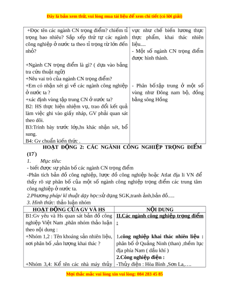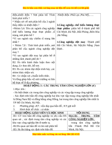 Ộ G 2: CÁC NGÀNH CÔNG NGHI P Ệ TR N Ọ G ĐI M Ể (17’) 1. M c t ụ iêu: - bi t ế đư c s ợ phân b ự ố các ngành CN tr ng đi ọ m ể -Phân tích b n ả đồ công nghi p, ệ lư c ợ đồ công nghi p ệ ho c ặ Atlat đ a ị li VN để thấy rõ sự phân bố c a ủ m t ộ số ngành công nghi p ệ tr ng ọ đi m ể các trung tâm công nghiệp n ở ước ta. 2.Phư ng pháp/ ơ kĩ thu t ậ d y h ạ c ọ :s d ử ng ụ SGK,tranh nh,b ả n đ ả ..... ồ 3. Hình th c ứ : th o l ả u n ậ nhóm HOẠT Đ N Ộ G C A Ủ GV VÀ HS N I Ộ DUNG