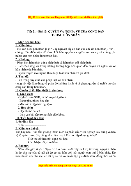 Tiết 21 - Bài 12: QUYỀN VÀ NGHĨA VỤ CỦA CÔNG DÂN TRONG HÔN NHÂN I. Mục tiêu bài học: 1. Kiến thức: