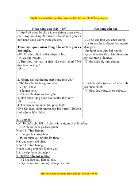 GV: Kết luận: định hướng cho HS ở tuỏi THCSvè tình yêu và hôn nhân. 4. Củng cố: