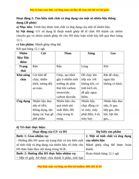 c) Sản phẩm: Mảnh ghép tổng thể. Kết quả bảng 12.1 sgk Nhiên Củi Than Xăng Gas liệu/ Đặc điểm Trạng Rắn Rắn Lỏng Khí thái