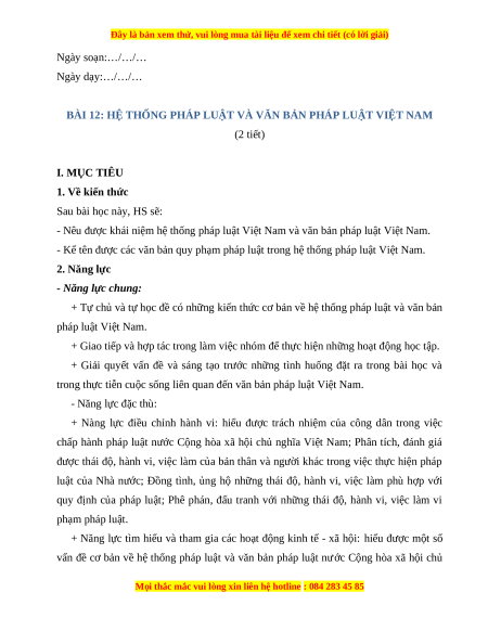 BÀI 12: HỆ THỐNG PHÁP LUẬT VÀ VĂN BẢN PHÁP LUẬT VIỆT NAM (2 tiết) I. MỤC TIÊU 1. Về kiến thức Sau bài học này, HS sẽ: