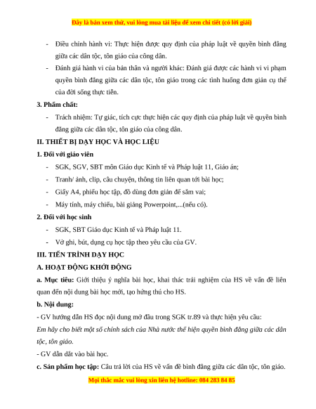 - Nêu được một số quy định của pháp luật về quyền bình đẳng giữa các tôn giáo. b. Nội dung: