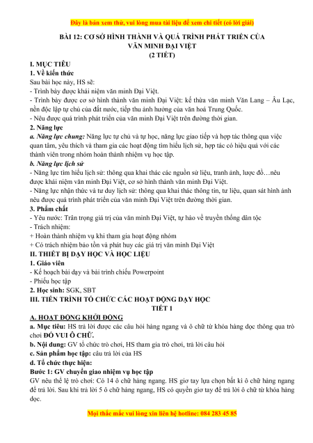 BÀI 12: CƠ SỞ HÌNH THÀNH VÀ QUÁ TRÌNH PHÁT TRIỂN CỦA VĂN MINH ĐẠI VIỆT (2 TIẾT) I. MỤC TIÊU 1. Về kiến thức Sau bài học này, HS sẽ: