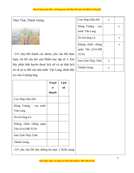 sử về sự ra đời của nhà nước Văn Lang, đánh dấu (x) vào ô tương ứng: Truyề Lịch n sử thuyết Con rồng cháu tiên Hùng Vương - vua nước Văn Lang Di tích làng Cả Kháng chiến chống quân Tần (214-208 TCN) Sơn Tinh Thủy Tinh Thánh Gióng