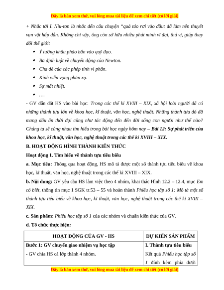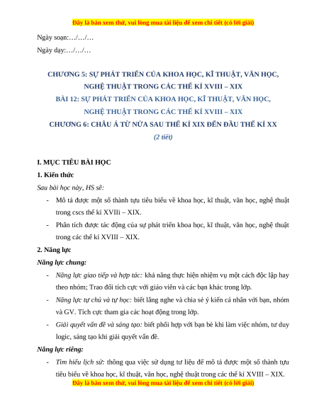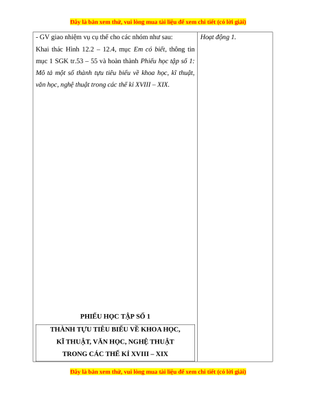 Giáo án Bài 12 Lịch sử 8 Cánh diều (2024): Sự phát triển của khoa học, kĩ thuật, văn học, nghệ thuật trong các thế kỉ XVIII - XIX