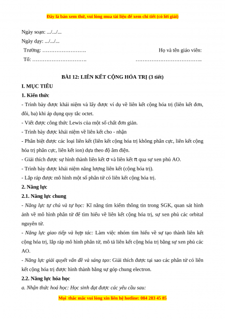 BÀI 12: LIÊN KẾT CỘNG HÓA TRỊ (3 tiết) I. MỤC TIÊU 1. Kiến thức