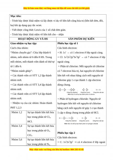 Giáo án Bài 12: Liên kết cộng hóa trị Hóa học 10 Kết nối tri thức