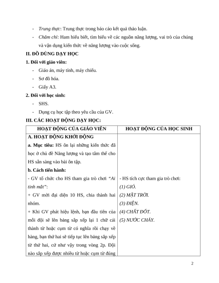 Những kiến thức đã học từ chủ đề Năng lượng. 2. Năng lực: