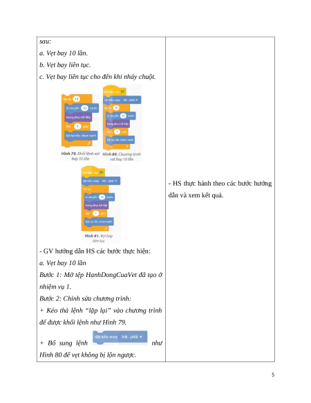 tạo khối lệnh như hình minh họa trong Hình 78. Hành động Lệnh Vẹt di chuyển 10 bước Vẹt vỗ cánh Đợi 1 giây