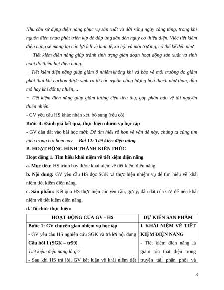 - Sau khi HS trả lời, GV kết luận về khái niệm tiết truyền tải, phân phối và 3 kiệm điện năng.