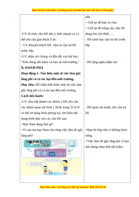 “Tiêu dùng tiết kiệm và bảo vệ môi trường.” - HS lắng nghe nhận xét. B. KHÁM PHÁ